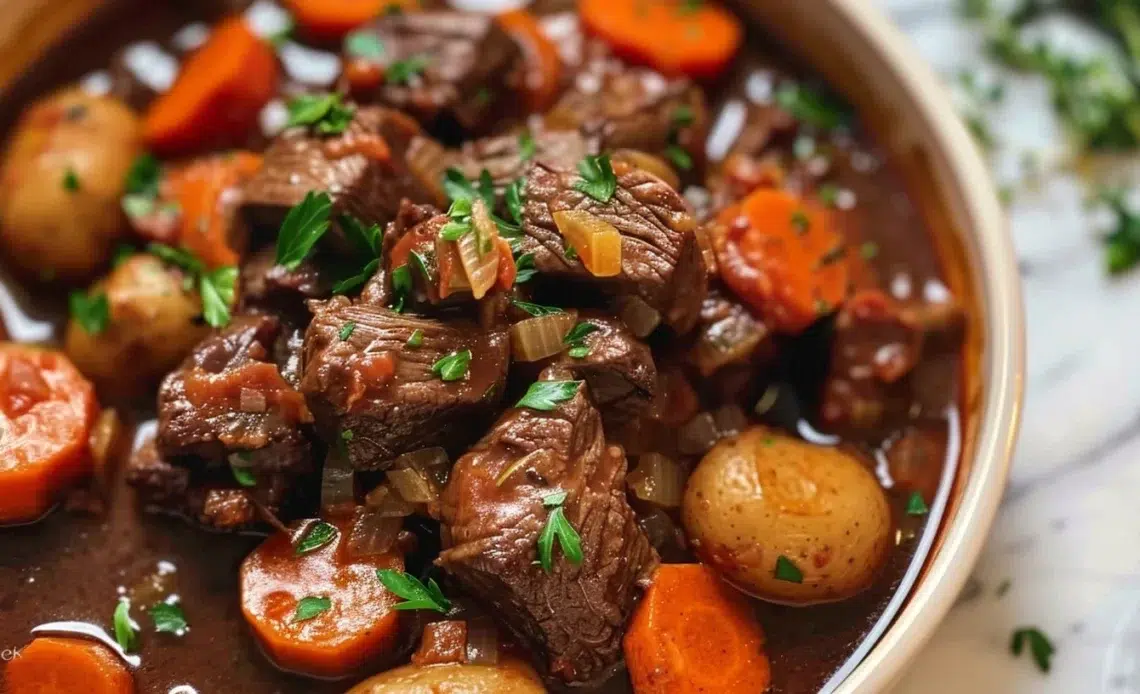 Un plat classique français de viande tendre mijotée avec des légumes savoureux dans une sauce riche au vin.
