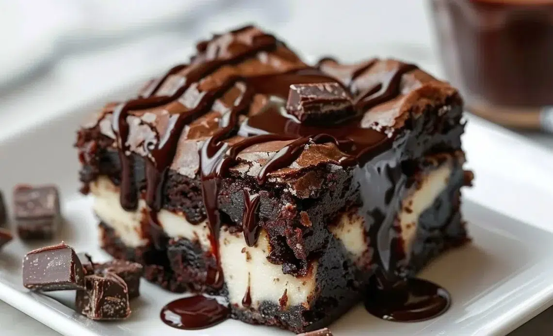 Des brownies irrésistibles combinés avec un cheesecake crémeux et nappés de sauce fudge chaude, parfaits pour toutes les occasions.