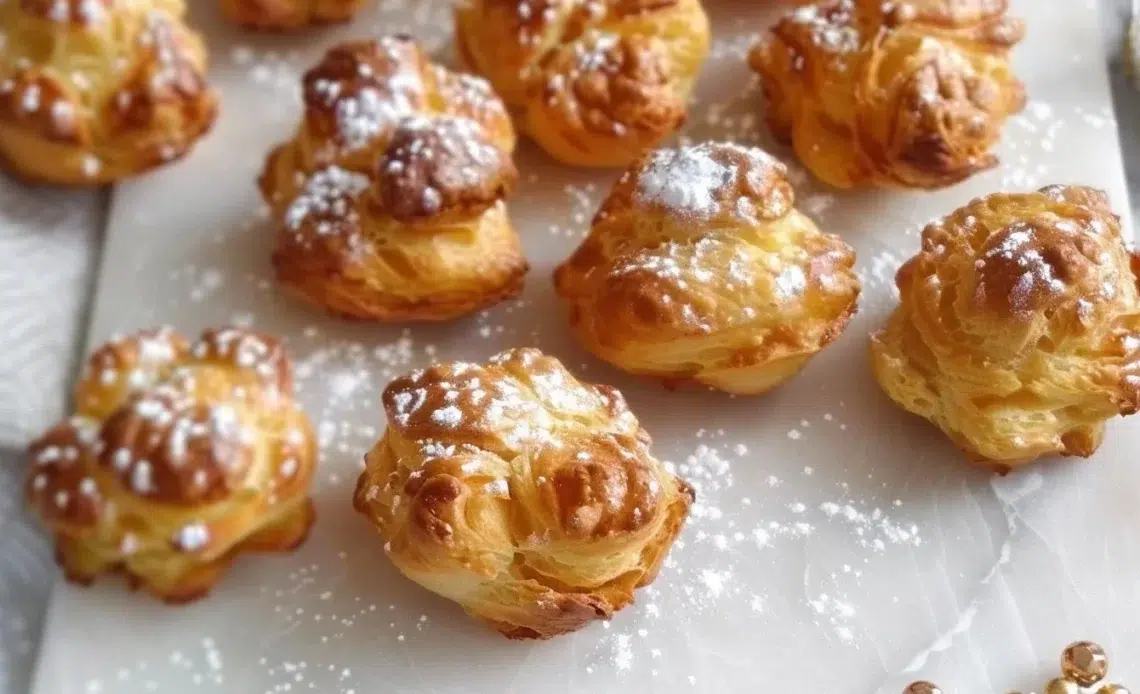 Chouquettes dorées saupoudrées de sucre, petites pâtisseries légères et aériennes.