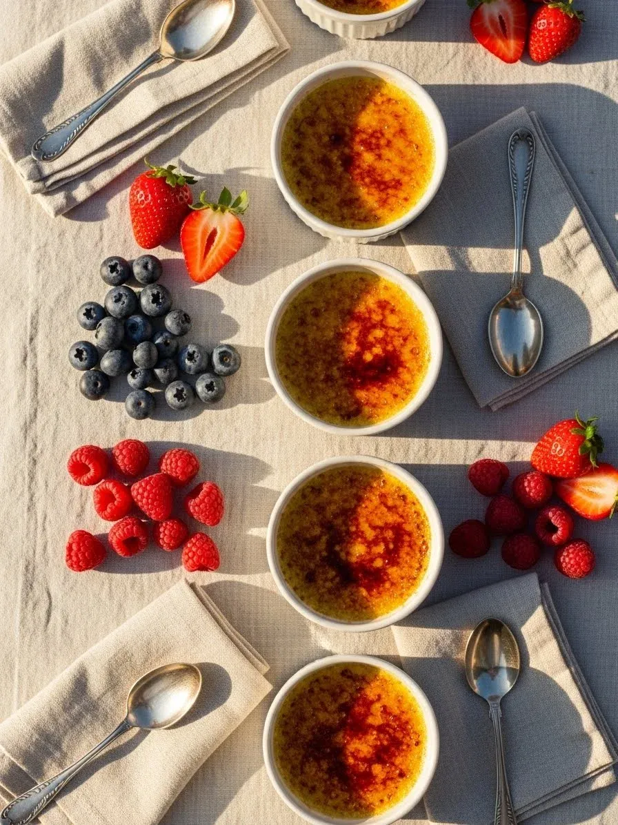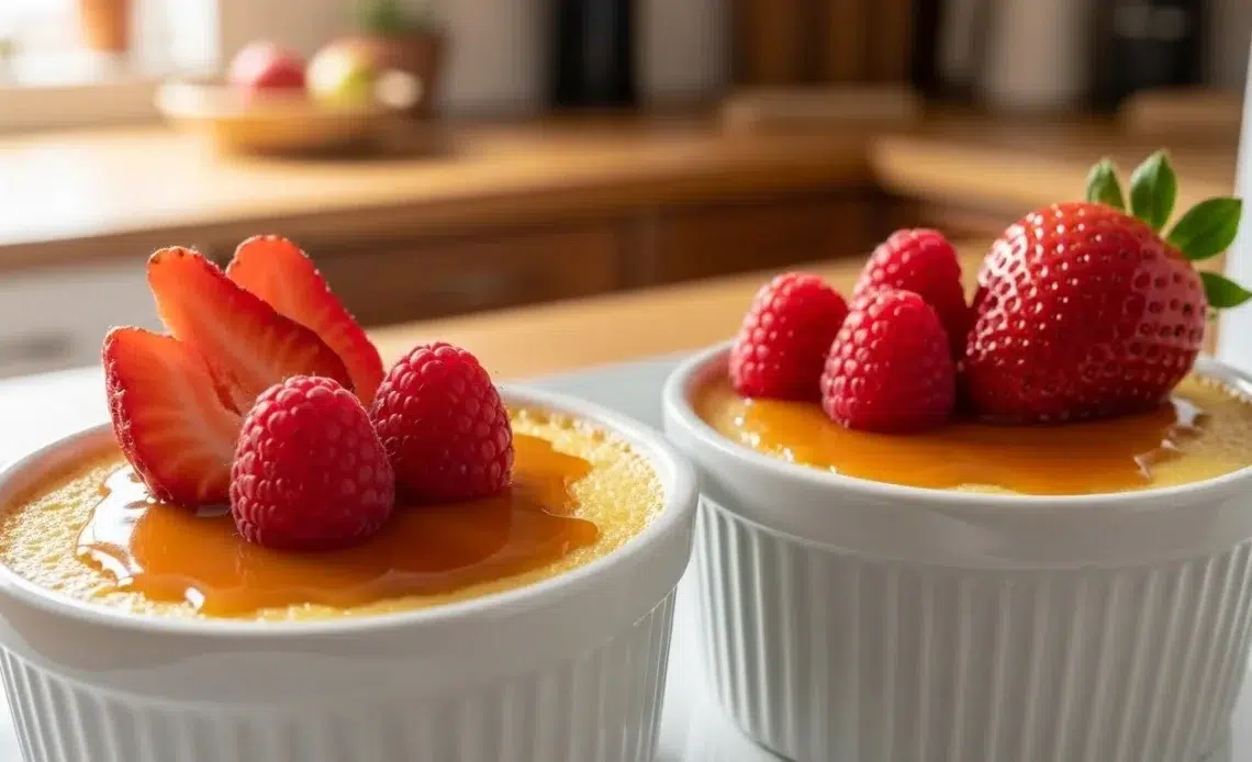 Juste avant de servir, décore avec quelques fruits frais : fraises coupées, framboises, myrtilles, billes de poire ou quartiers de clémentine selon la saison. Les fruits apportent couleur, fraîcheur et une légère acidité qui équilibre le côté sucré du caramel et de la crème.