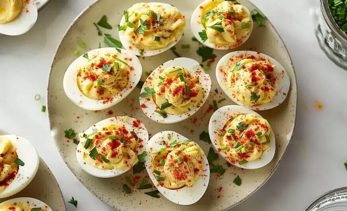 Saupoudrez le dessus des œufs farcis avec un peu de paprika pour la garniture et ajoutez quelques herbes fraîches pour une touche de couleur. Servez-les frais, accompagnés d’une salade ou de tranches de pain.