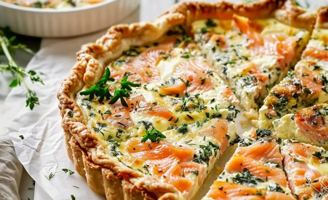 Une délicieuse quiche légère à base de pâte brisée et de saumon fumé, parfaite pour un brunch, un dîner rapide ou une occasion spéciale.