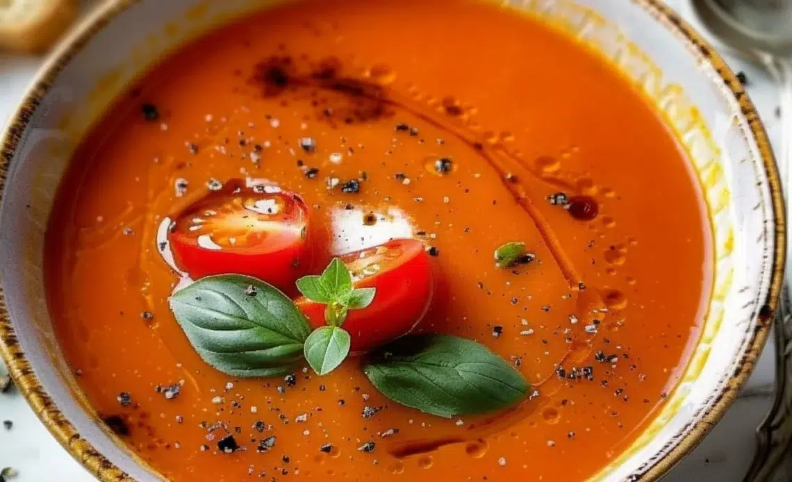 Saviez-vous qu’une bonne soupe à la tomate fraîche peut être à la fois simple, réconfortante et étonnamment raffinée ? Cette recette transforme des tomates mûres en une soupe onctueuse, parfumée à l’ail et à l’oignon, idéale pour les soirs où l’on veut quelque chose de sain et rapide sans sacrifier le goût. La texture est veloutée, l’acidité des tomates est équilibrée par l’huile d’olive et un bouillon savoureux — en bouche, c’est la chaleur du potage de grand-mère modernisée. Cette recette est spéciale parce qu’elle met en valeur la fraîcheur des ingrédients et reste très adaptable : vous apprendrez ici des astuces pour sublimer vos tomates, conserver la soupe, la réchauffer correctement et même la transformer selon vos envies.