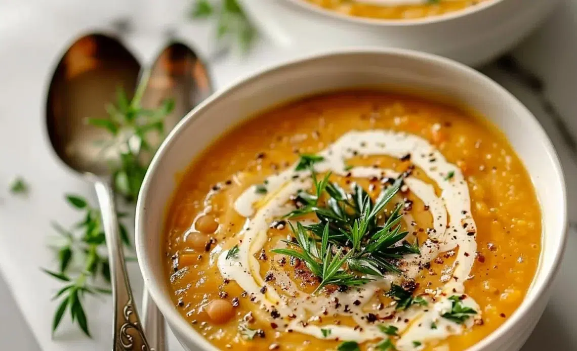 Servez la soupe chaude, garnie d’herbes fraîches comme du persil ou du thym pour ajouter une touche de couleur et de saveur fraîche.
