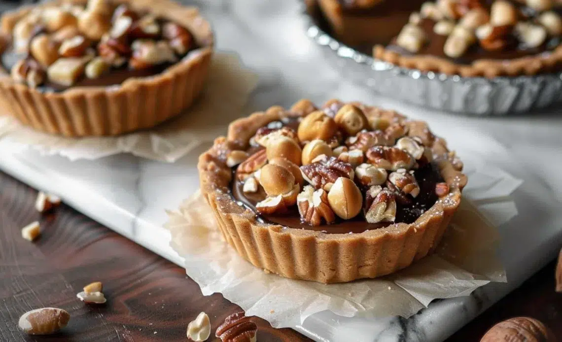 Des tartelettes fondantes au Nutella, garnies d'une crème pralinée onctueuse et surmontées de noisettes caramélisées croustillantes.
